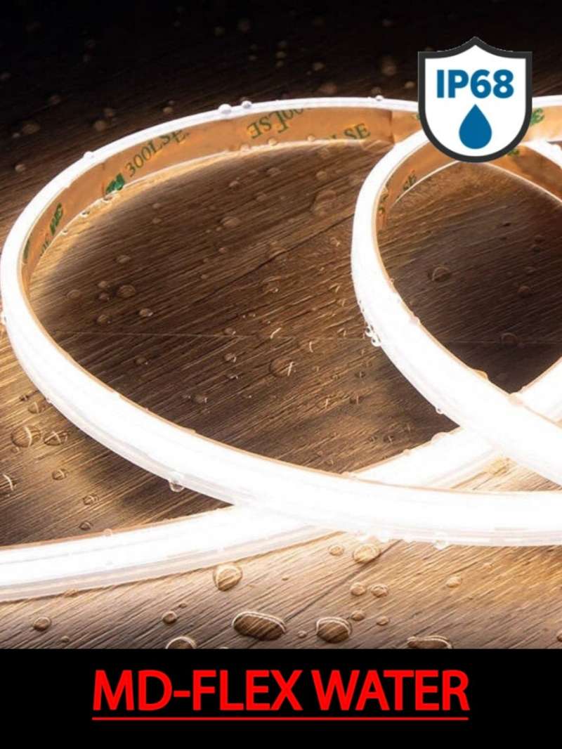 Grazie al totale riempimento in resina poliuretanica a isolamento del Led, anche MD-FLEX WATER permette un’ ampia diffusione della luce, che assicura risultati più brillanti e uniformi. Ha un grado di protezione pari a IP68 e IP69K